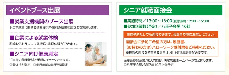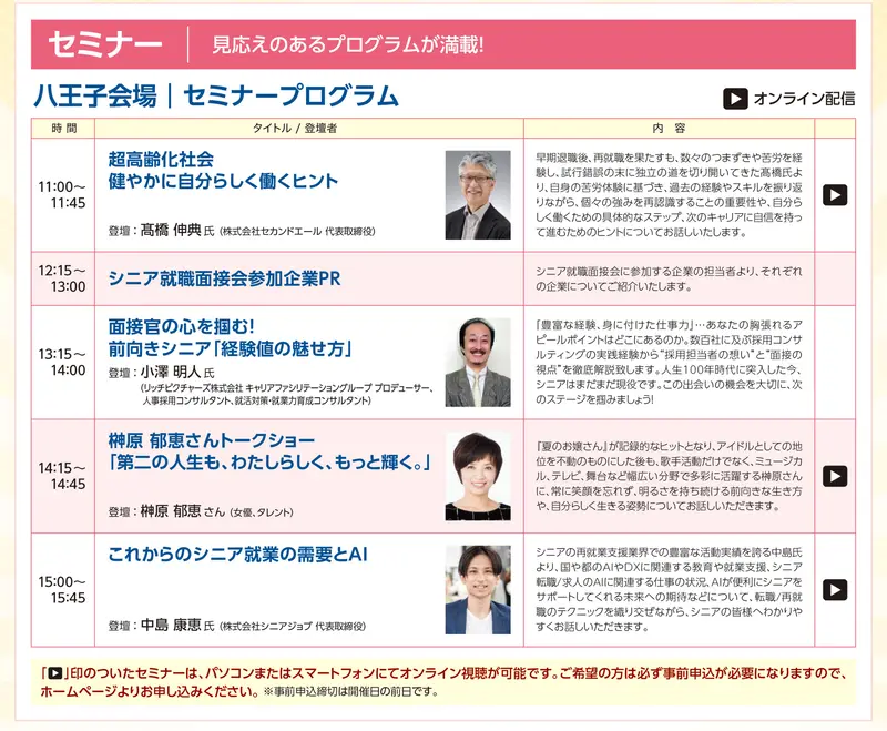 イベントでは、著名人によるトークショーや就業支援セミナー、シニア就業の支援機関による就業相談ブース、シニア向けの健康測定等の様々なプログラムを用意すると共に、合同就職面接会を同時開催いたします。
