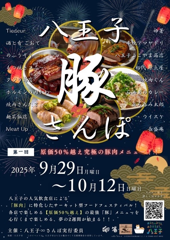 2025年9月29日(月)~10月12日(日)、八王子の人気飲食店18店舗が集結する『八王子豚さんぽ』が初開催されます。原価率50%超の限定豚肉メニューを食べ歩ける、お得で贅沢なフードフェスです!