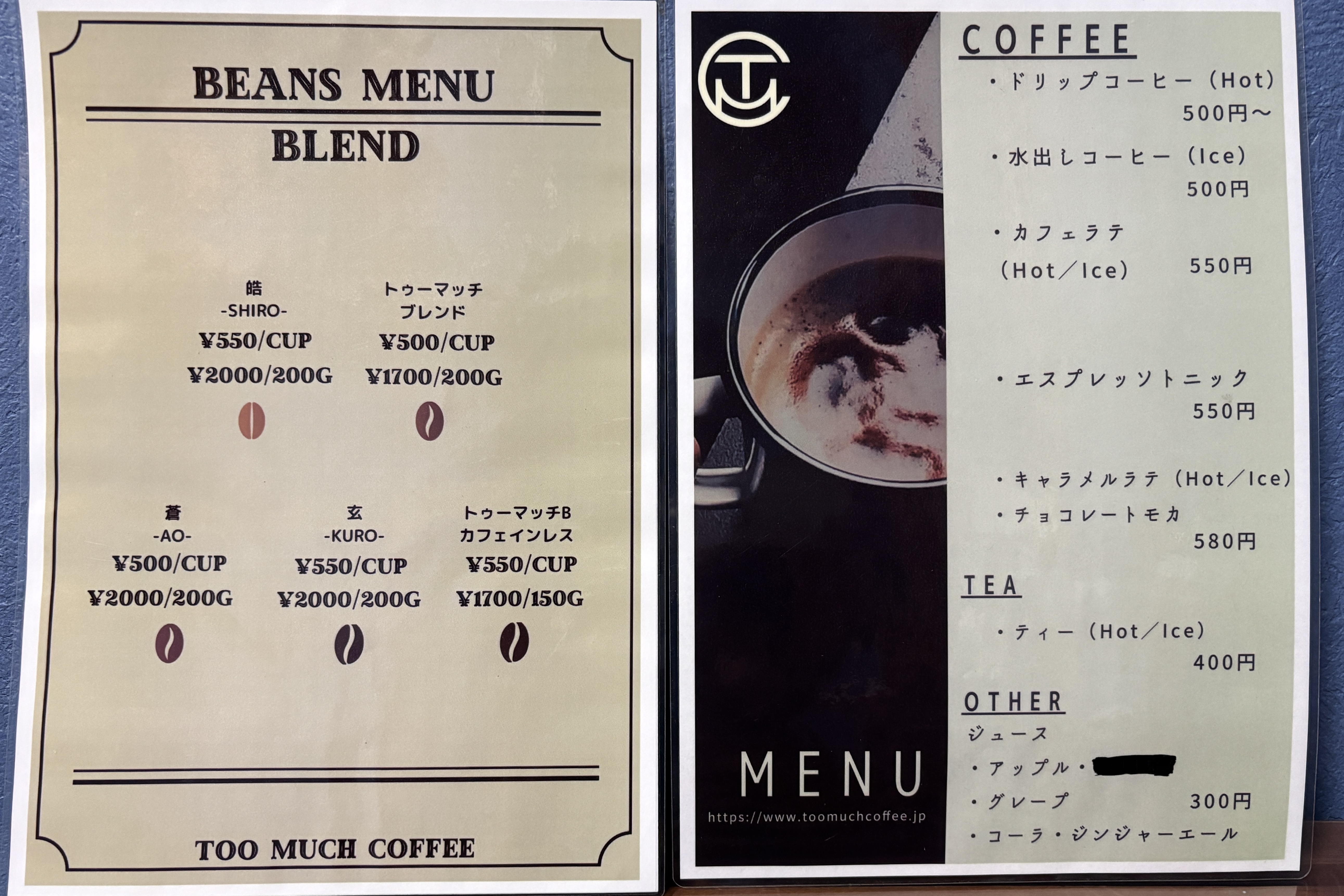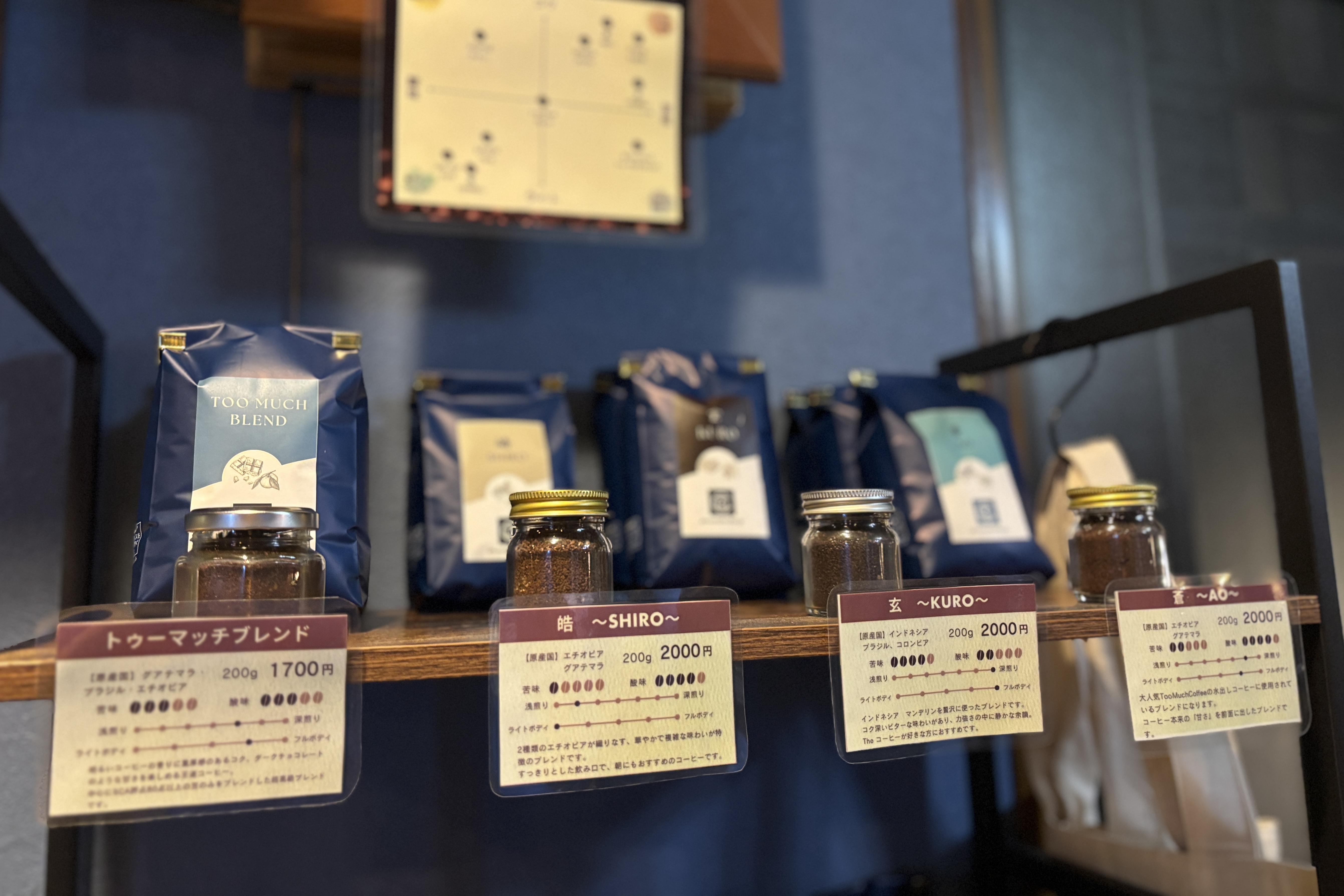 9月で開業2年になるという『Too Much Coffee』。専用の焙煎所で丁寧に焙煎されたスペシャルティコーヒーは、1杯から注文することもできます。