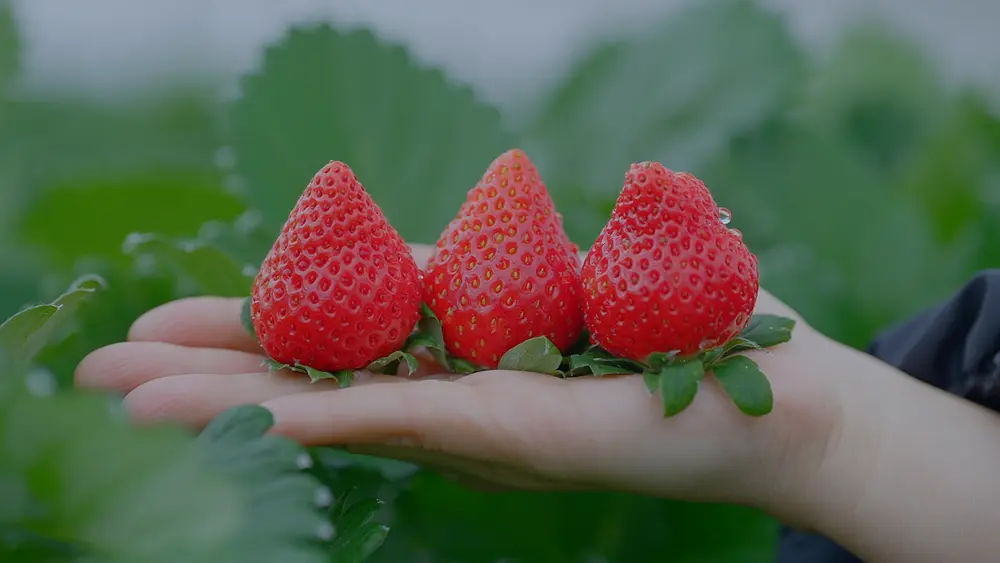 鮮やかな赤い実の中に詰まっているのは、水が磨いた澄んだ甘み。食べた瞬間、まるで山の湧き水をそのまま頬張ったような清涼感が広がります。水のめぐみをそのまま果実に閉じ込めた、唯一無二のいちごです。
