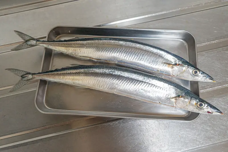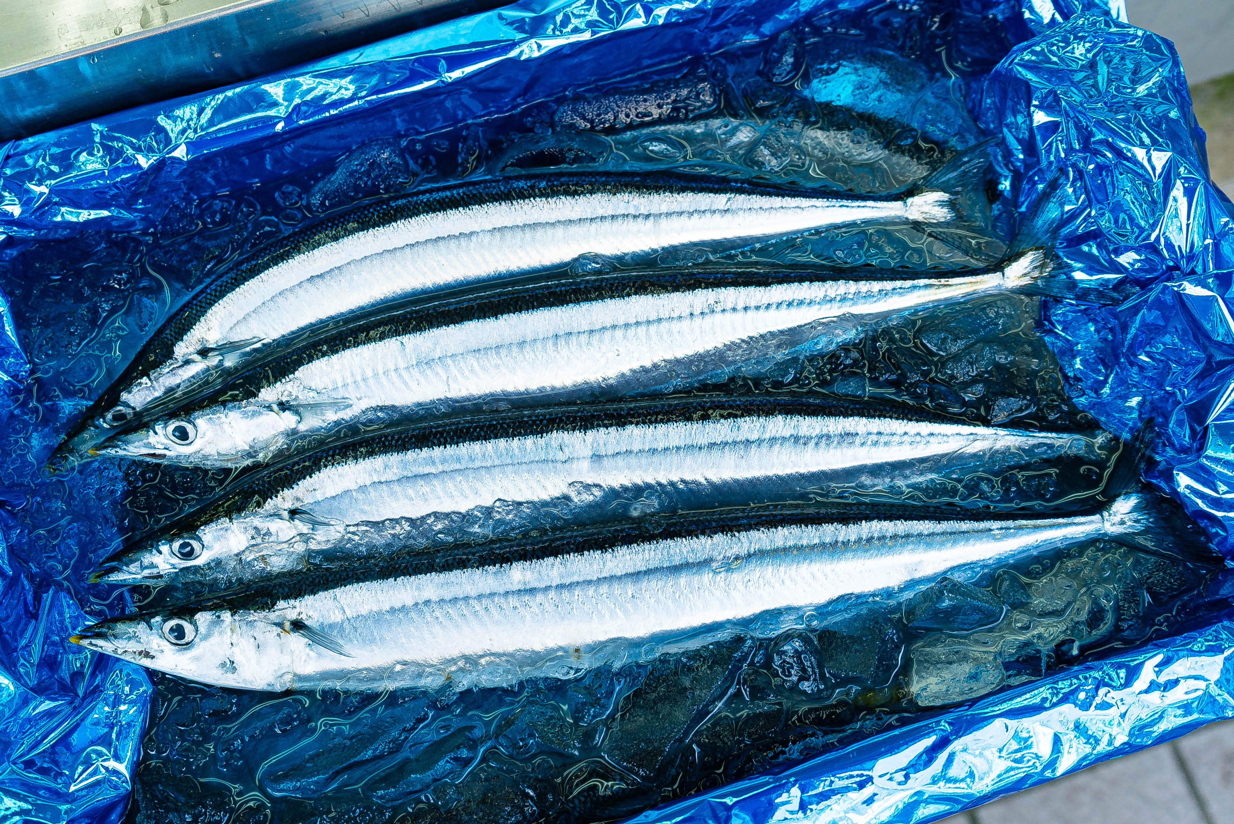魚政のサンマは老舗ならではの目利きで選ばれ、鮮度も魚体の張りも別格。指3〜4本はありそうな太さで、背から見ても厚みが違います。まるでタチウオと見紛うほどの立派さ!