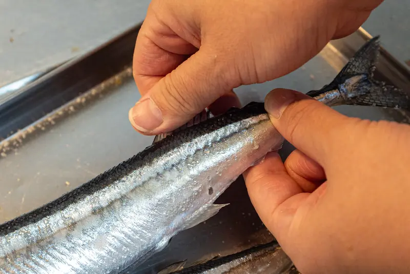 コンロで焼く場合は、ヒレに化粧塩を施すと、焼き落ちにくくなるだけでなく、焼き上がったときにヒレがピンと立ち、見た目も美しく仕上がります。さらに、塩味に濃淡が生まれ、旨みのグラデーションを楽しむことができます。