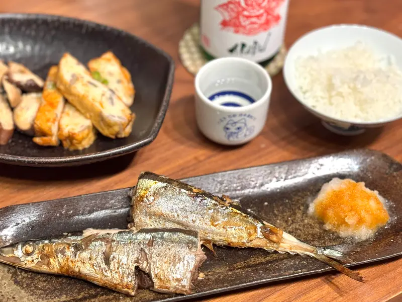 焼き上がったサンマに大根おろしとすだちを添えれば、脂のジュワッとした旨みと爽やかな酸味が最高の相性です!