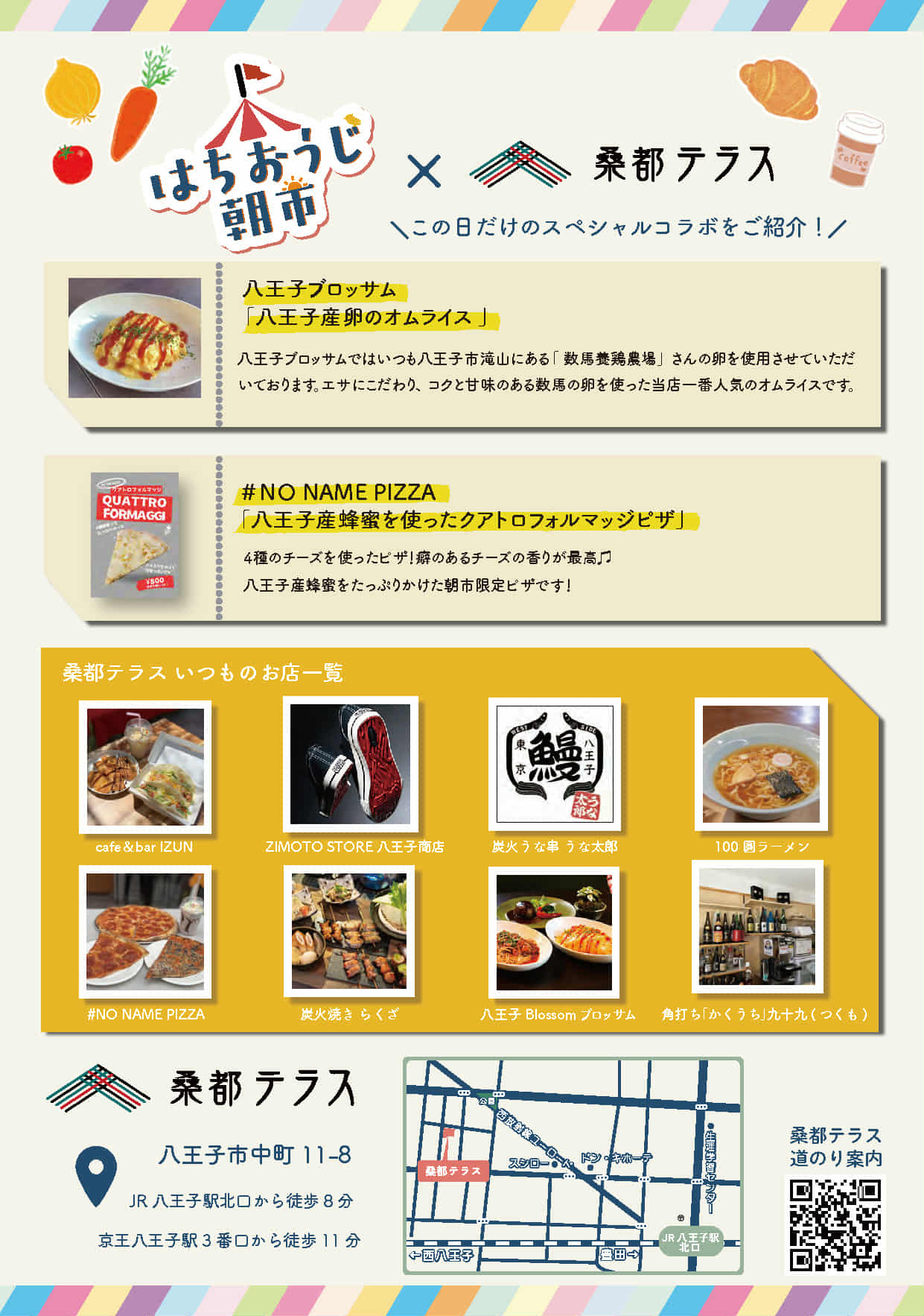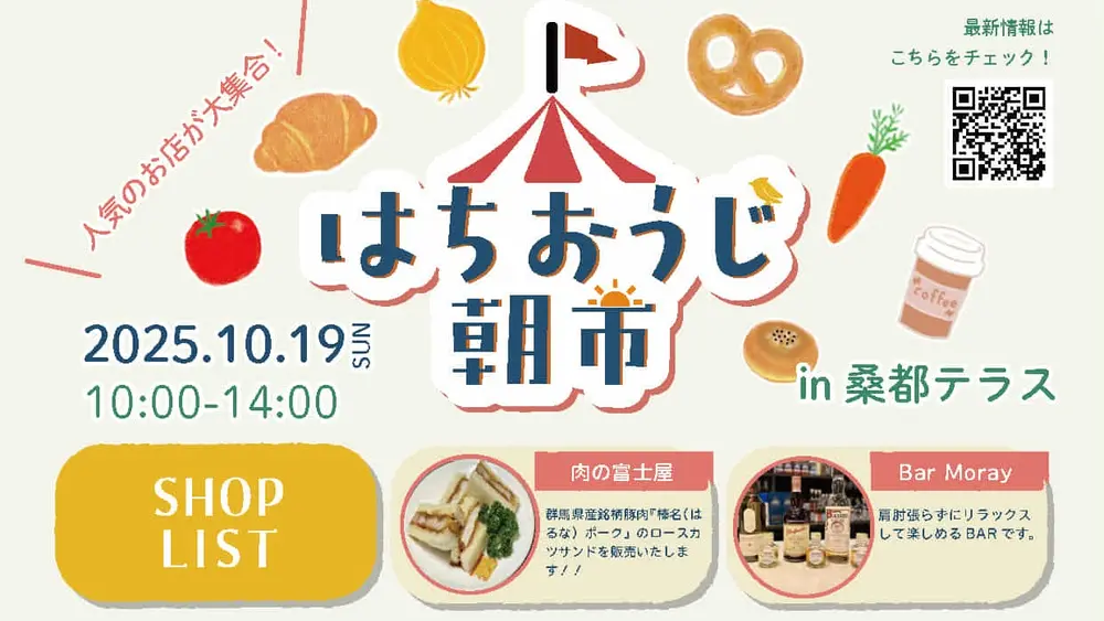 日曜の朝に桑都テラスで開かれる『八王子朝市』。地元の人気店から雑貨・グルメまでが勢ぞろいし、回を重ねるごとに注目度が高まるマルシェです。今回は秋の味覚や限定コラボメニューにも注目です。