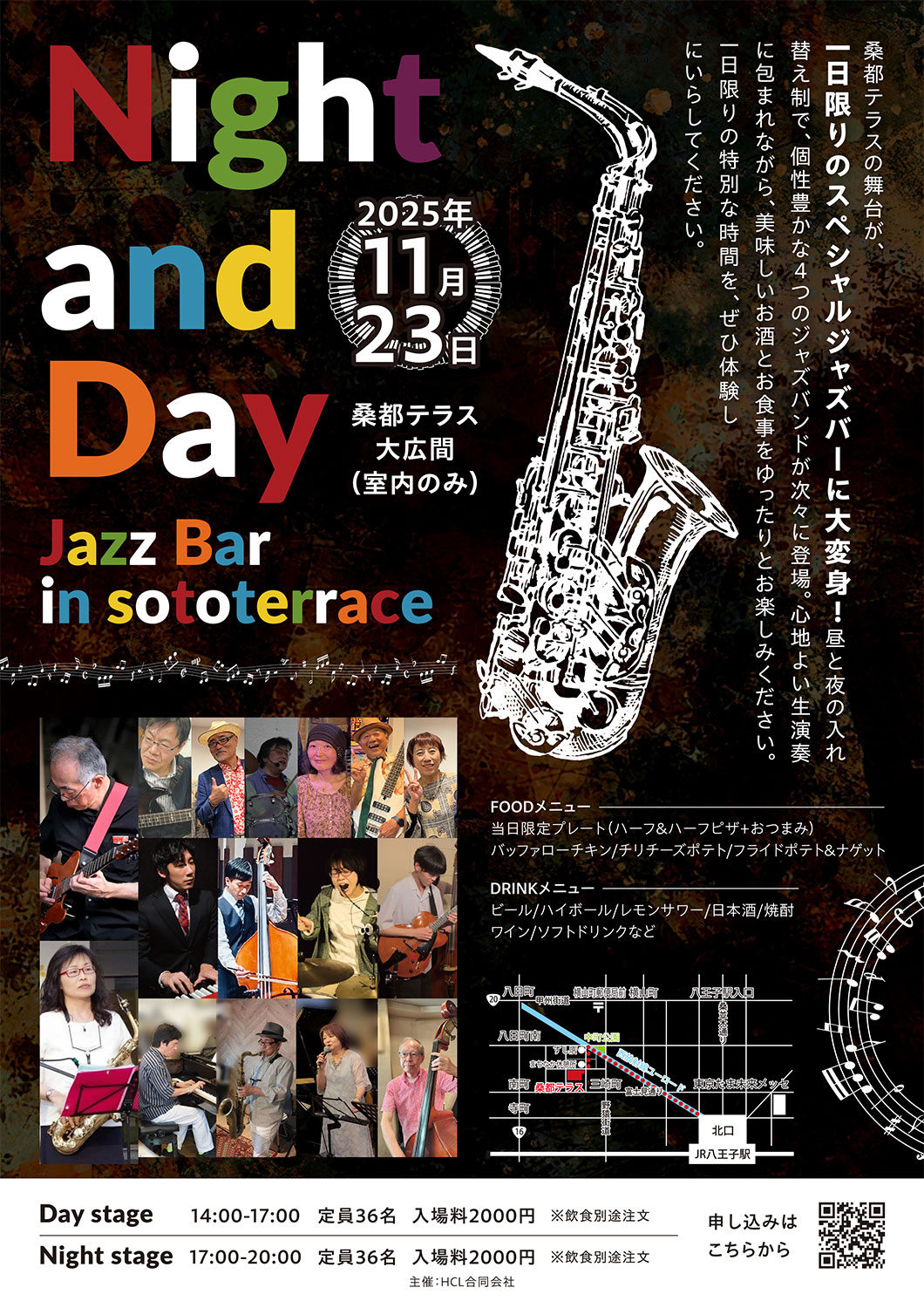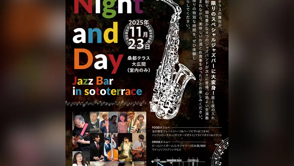2025年11月23日(土)、桑都テラスにて一日限りのスペシャルイベント『Night and Day Jazz Bar in sototerrace』が開催されます。ジャズの生演奏とお酒、フードを楽しめる本イベントは、昼と夜の二部制で構成され、それぞれ異なる2組のバンドが出演。