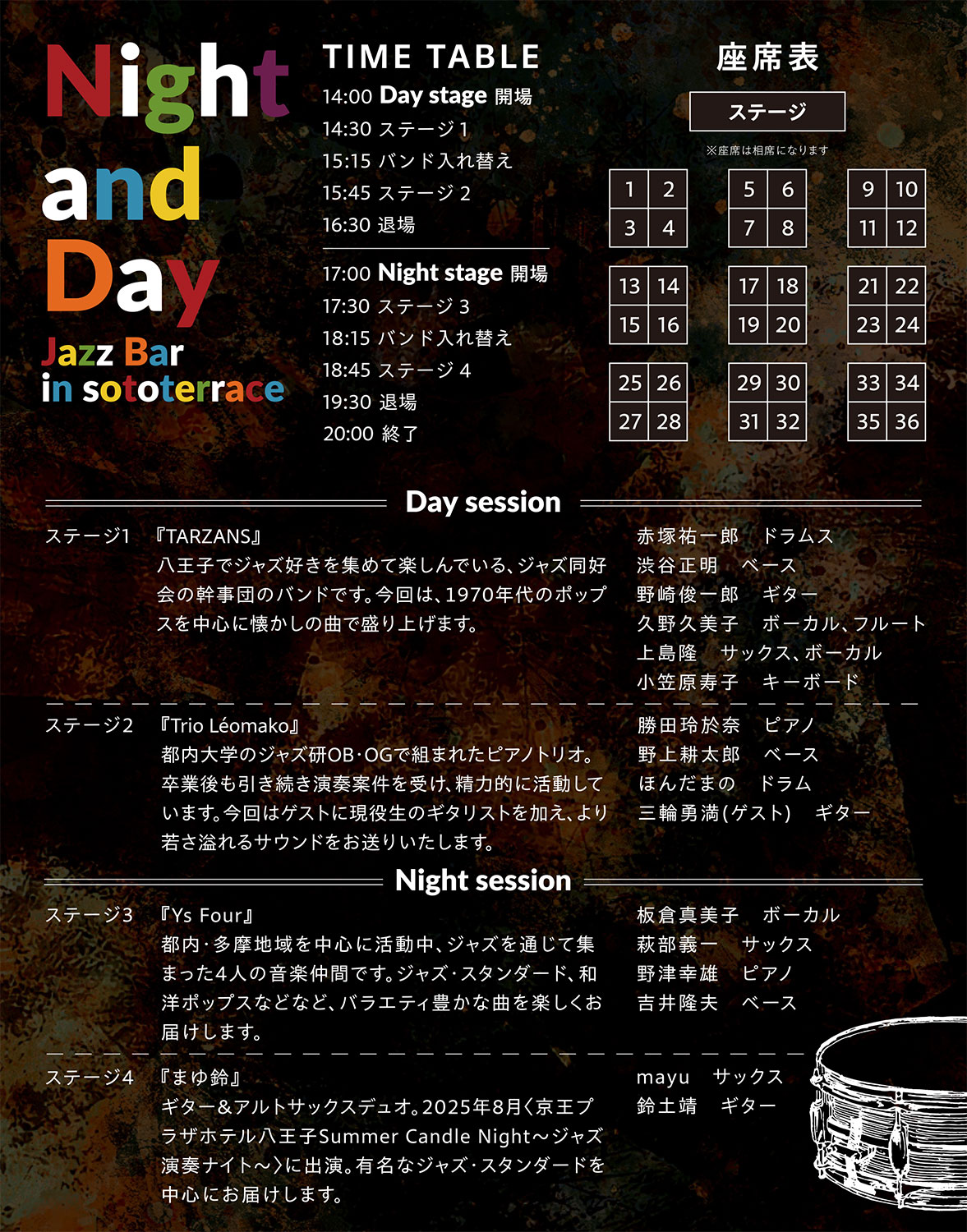 会場は桑都テラスの大広間(室内開催)。昼の部「Day Stage」と夜の部「Night Stage」では、計4組のジャズバンドが登場。ジャンルや構成の異なる演奏で、訪れる時間帯によって異なる音楽体験が楽しめます。