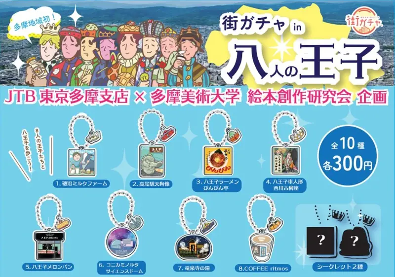 『街ガチャin多摩』の第一弾として、八王子の観光スポットや人気店をモチーフにしたアクリルキーホルダーが登場!イラストは多摩美術大学の学生による描き下ろしで、学生コラボの街ガチャは全国初。シークレット2種の全10種です。
