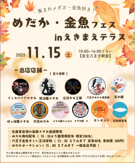 京王八王子駅前のえきまえテラスで、2025年11月15日(土)に『めだか・金魚フェス in えきまえテラス』が開催!めだかの直売や無料配布、オークション、金魚すくいなど、めだか&金魚好きにはたまらない内容になっていますよ。
