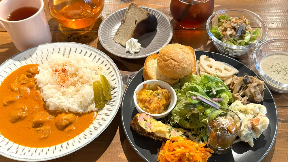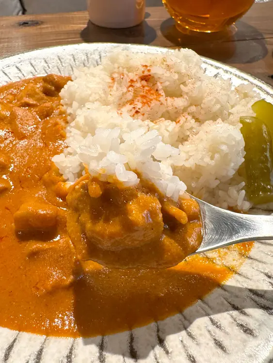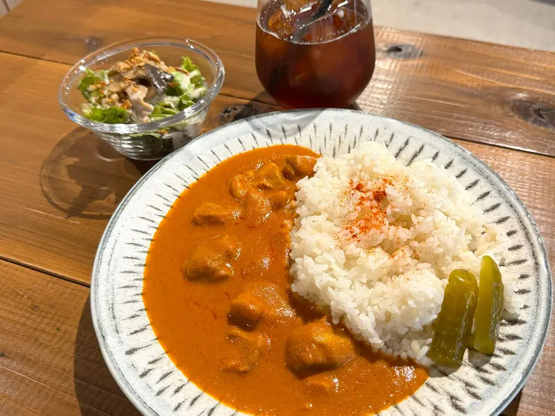 もう一つの人気メニューがカレーセット。この日のカレーは、スパイスを一から調合したバターチキンカレー。スパイスの風味は感じつつ、辛さより“まろやかさ”が主役。甘めバターチキン好きに刺さる味わいです。お子さまでも食べられます!!