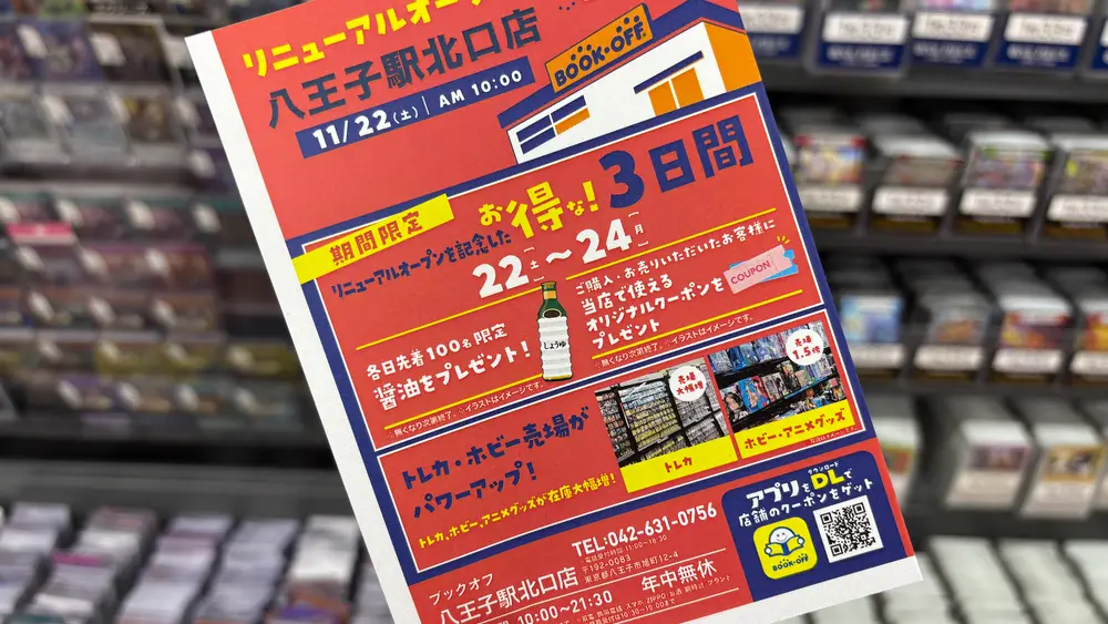 改装工事に伴い現在休業中の『BOOK OFF 八王子駅北口店』が、2025年11月22日(土)に再オープンします。人気のトレカやホビー売り場が大幅に拡大し、オープン記念の来店者向けの企画も予定されている注目のリニューアルです!