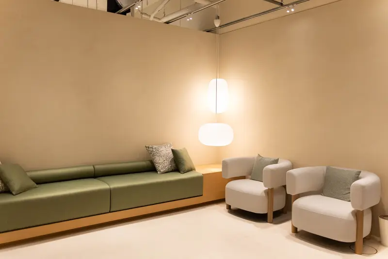 扉を開けると、白と木目・オリーブグリーンを基調にした落ち着いた空間が広がります。