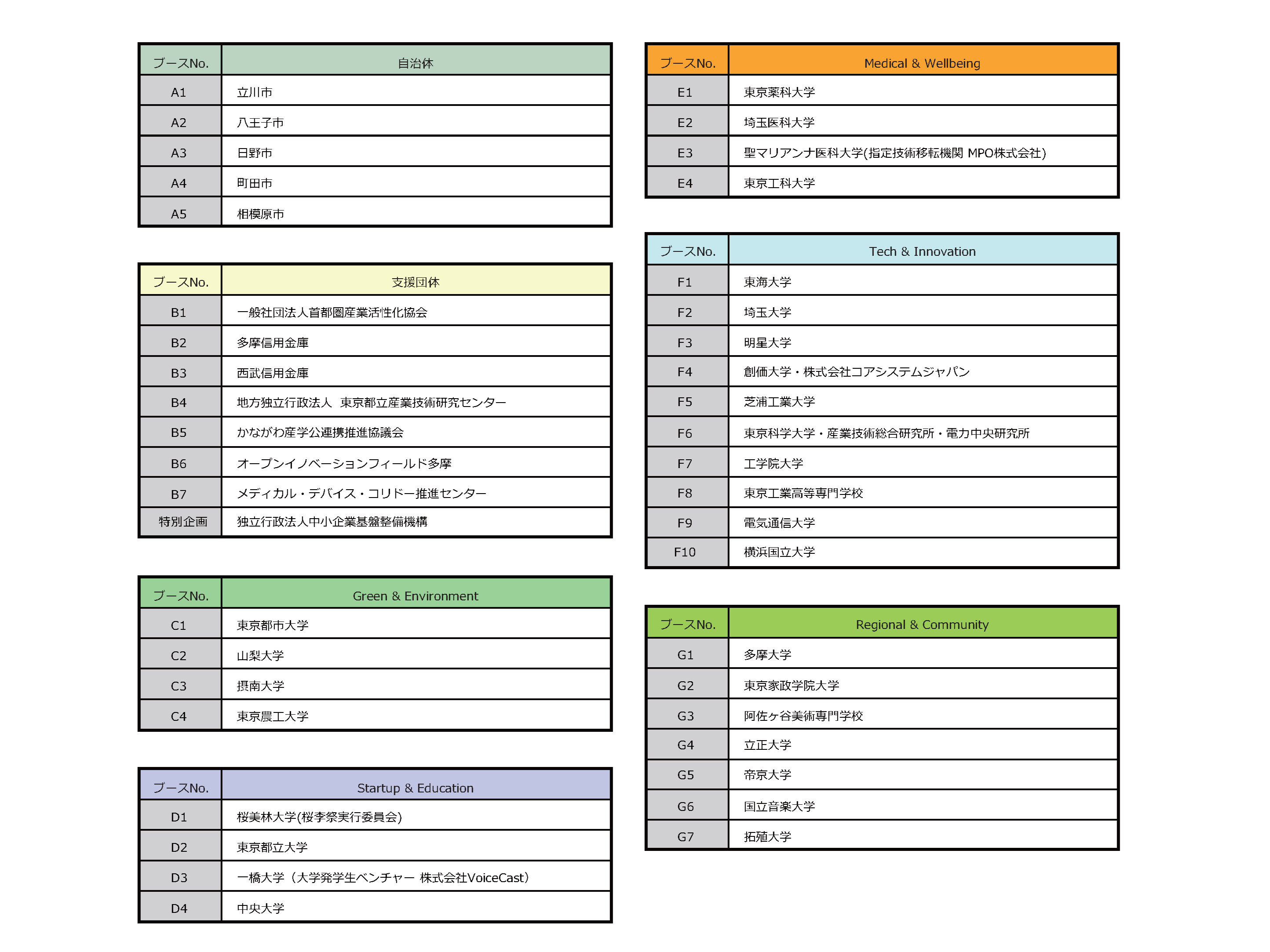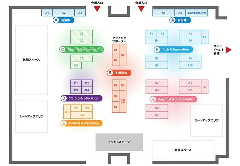 会場は、来場者が回遊しやすく、また偶然の出会いが生まれやすいよう、学術機関の出展シーズを5つのテーマに区分し、エリア分けを行っています。