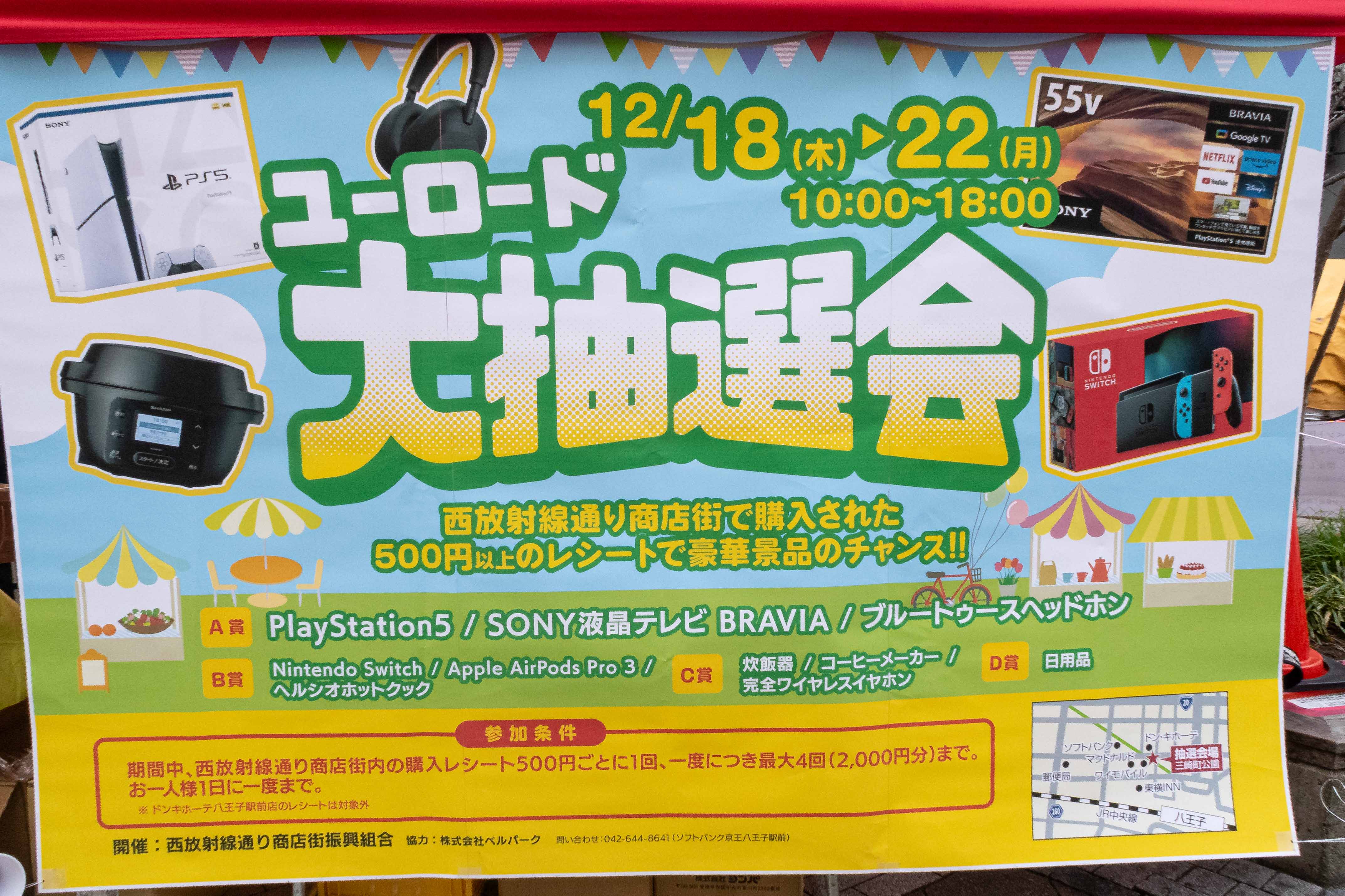 2025年12月22日(月)まで、八王子駅前・ユーロード沿いの三崎町公園で『ユーロード大抽選会』が開催中。ユーロード通り商店街で500円以上買い物をすると参加でき、PlayStation 5をはじめとした豪華賞品が当たるチャンス。買い物ついでに立ち寄りやすい駅前イベントです。