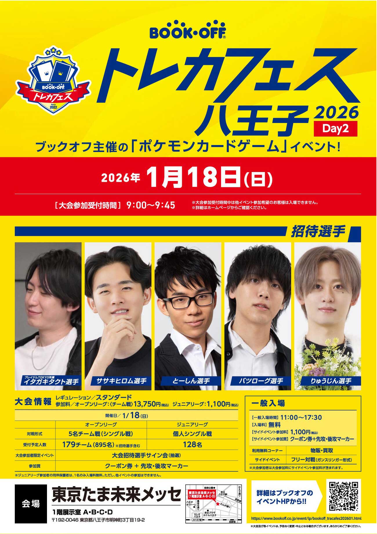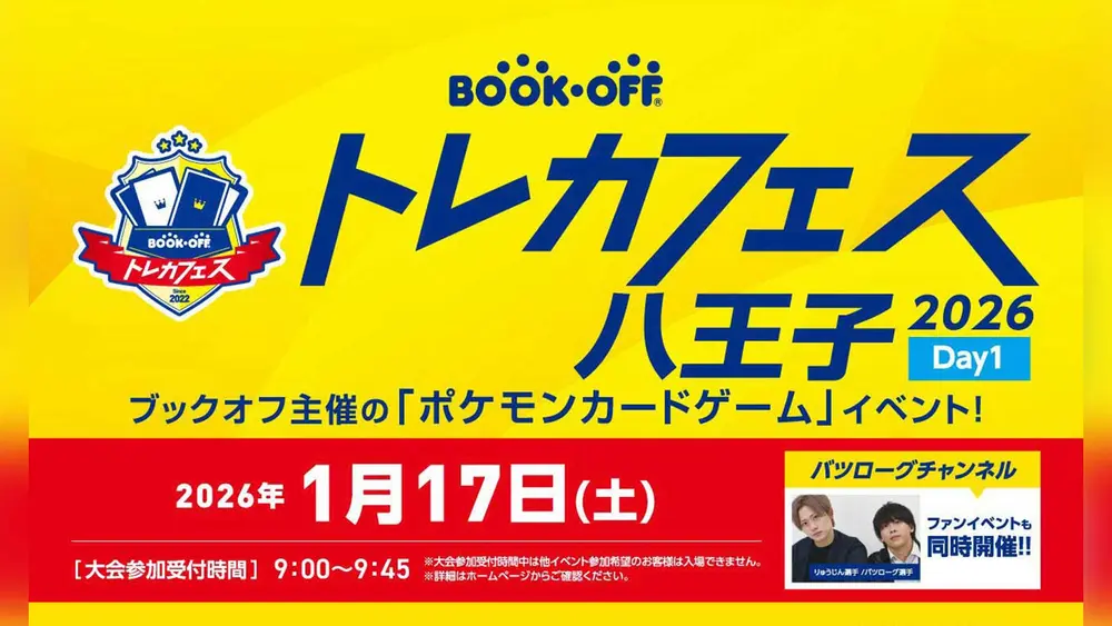 ブックオフ主催のポケモンカードゲームイベント『トレカフェス八王子2026』が2日間開催。Day1とDay2で大会形式や招待選手が異なり、両日楽しめる内容となっています。