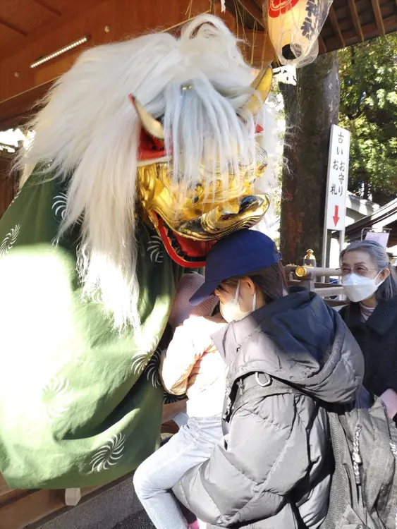 餅撒きのあとは、獅子に頭をかんでもらい厄払い