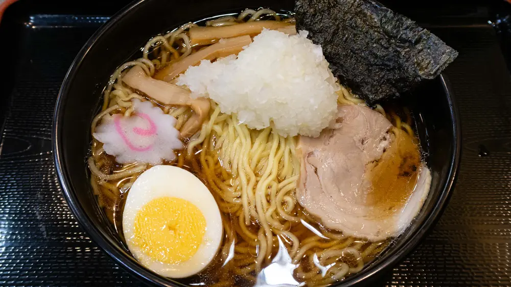 提供が早いのも富士そばの魅力。着席してからおよそ3分ほどで呼ばれました。こちらが富士そばの八王子ラーメン!刻み玉ねぎがたっぷり入り、海苔、チャーシュー、ナルト、卵と具材も充実しています。