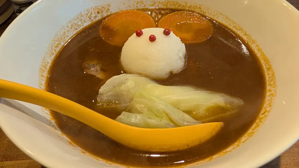 麺の上にちょこんと乗った、マッシュポテトと人参で出来たネズミのキャラクター、シゲッキーが印象的。見た目だけでなく、スープに溶かすことでまろやかさととろみが加わり、味の変化も楽しめます。ペッパーの刺激とトマトの酸味がアクセントとなり、最後まで飽きずに味わえます。
