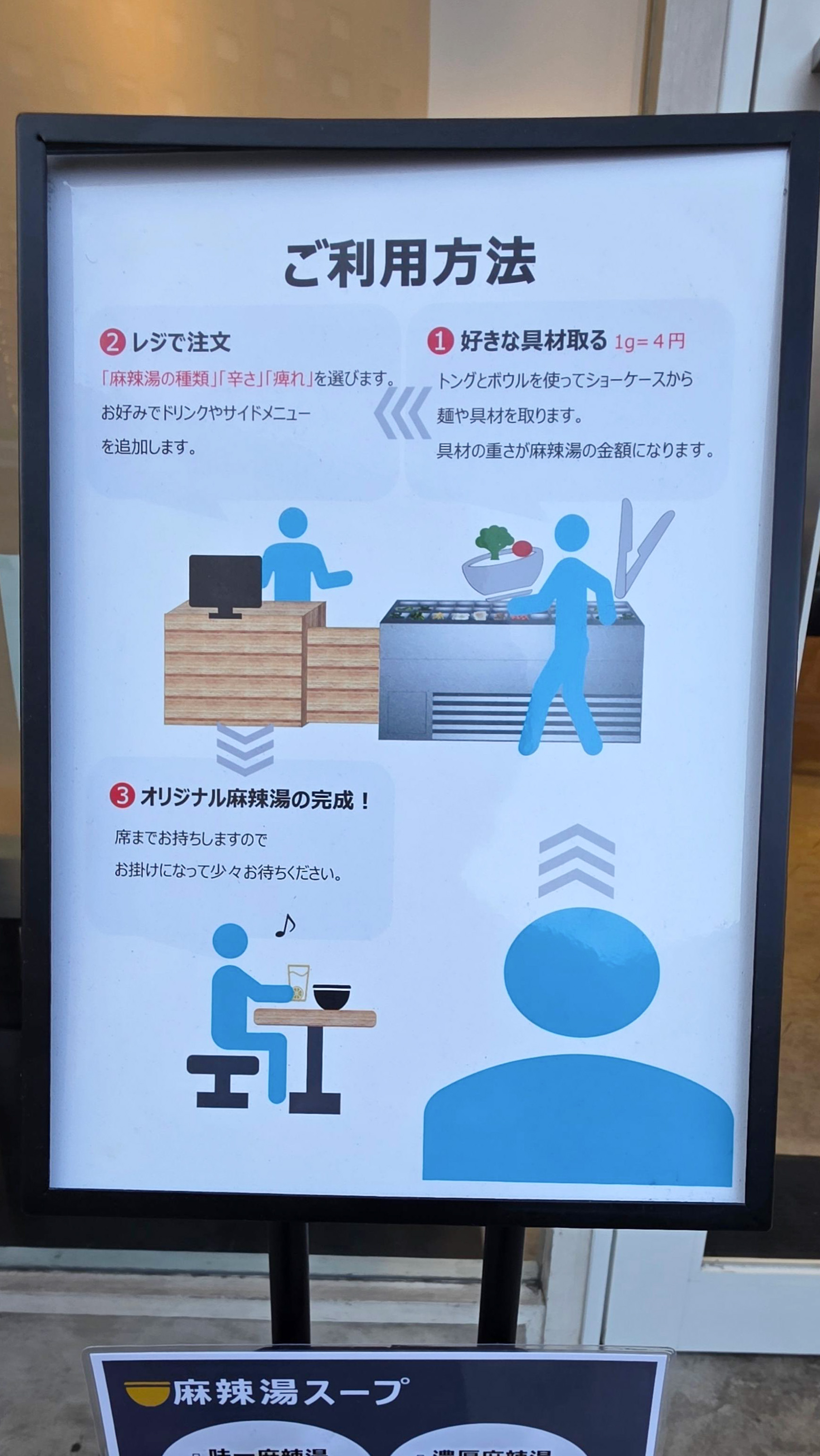 店頭にある看板でシステムが紹介されています。入店前でもわかりやすく解説されているので初めてでも安心ですね!
