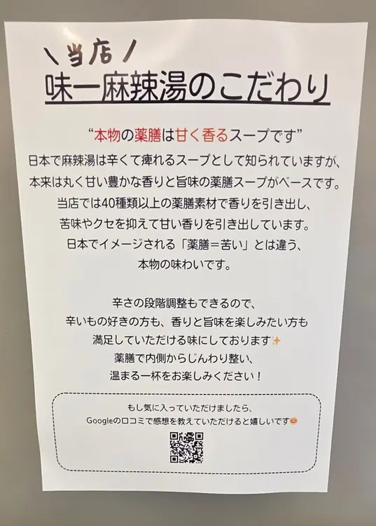 麻辣湯は、「選ぶ楽しさ」「刺激的なおいしさ」「健康への配慮」を同時に満たす、現代の食ニーズに完璧に合致したハイブリッド・グルメだと思います。今回はあっさりを頂きましたが、次回は濃厚でガッツリなスープを選んで食べてみたいと思います!