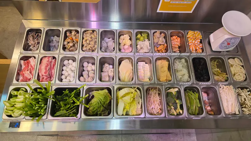 次にトッピングを選びます。32種類もあり迷ってしまいますね!季節ごとにトッピングを変更されるとの事で、それも楽しみ!ここでも好きな具材を好きなだけ選べます。計りが設置されているので、グラムを調整して選べます。