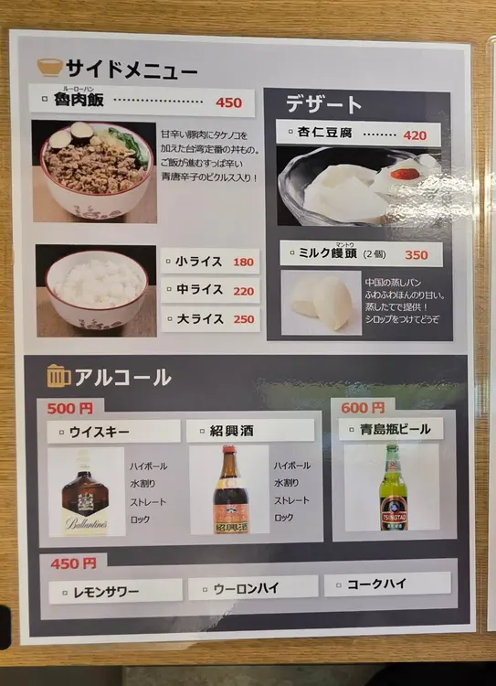 サイドメニューも豊富!お店のイチオシは魯肉飯です!ドリンクでは手打檸檬茶(しゅうだれもんちゃ)のマンゴー味が人気とのことでした。辛さとの相性がいいので一緒に注文されることをオススメします!