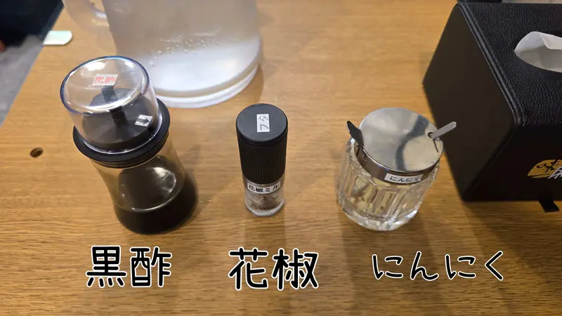 卓上調味料は、黒酢、花椒、にんにくがあり、食べている途中で味変ができます。