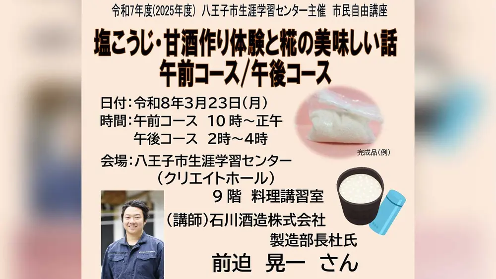 麹の基本を杜氏から学び、塩こうじと甘酒づくりを体験できる市民自由講座が開催されます。初心者でも分かりやすい解説と実習で、日々の料理に役立つ糀の知識を楽しく学べる内容です。