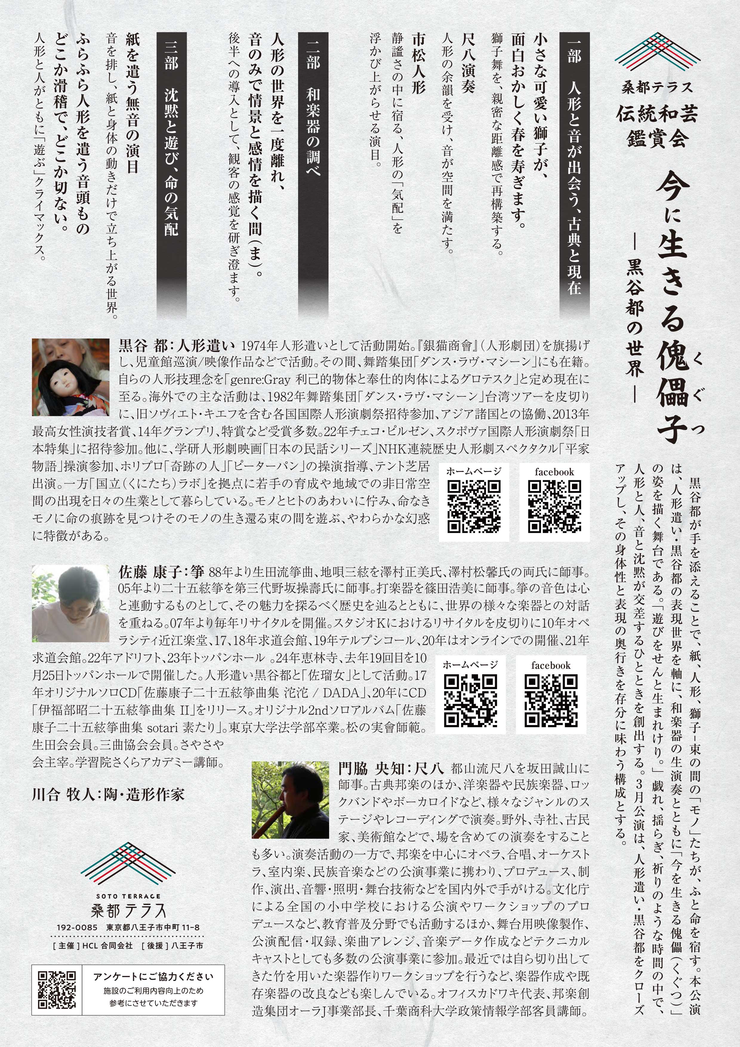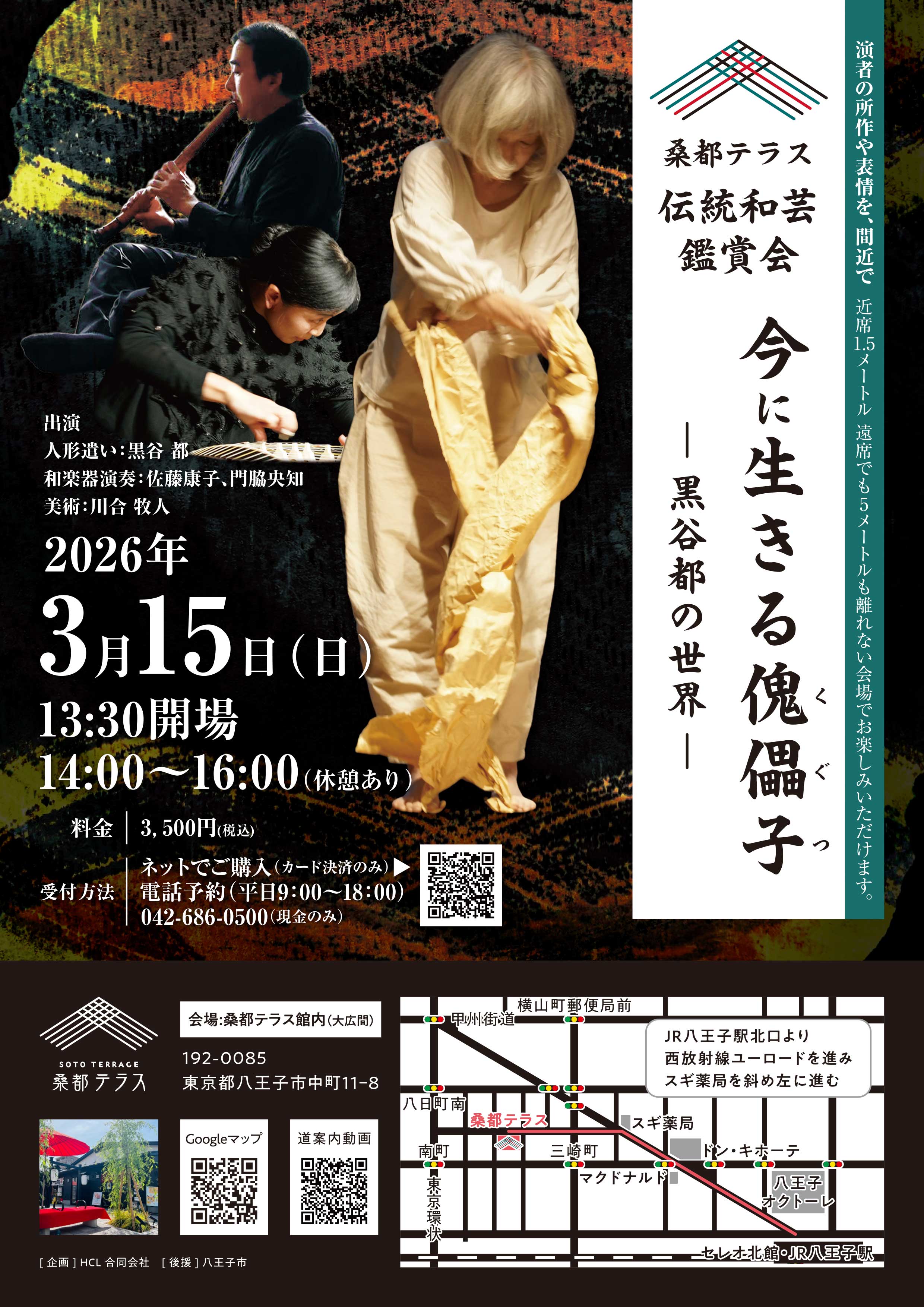 2026年3月15日(日)14:00~16:00、桑都テラス館内(大広間)で開催。黒谷都さんの人形遣いと箏・尺八の生演奏による三部構成で、獅子舞や音だけで情景を描く演奏など、古典の美意識と現代の感性が重なる舞台を間近で楽しめます。料金3,500円、ネット購入または電話予約(042-686-0500)。詳細は下記の案内もしくは公式HPをご確認ください。