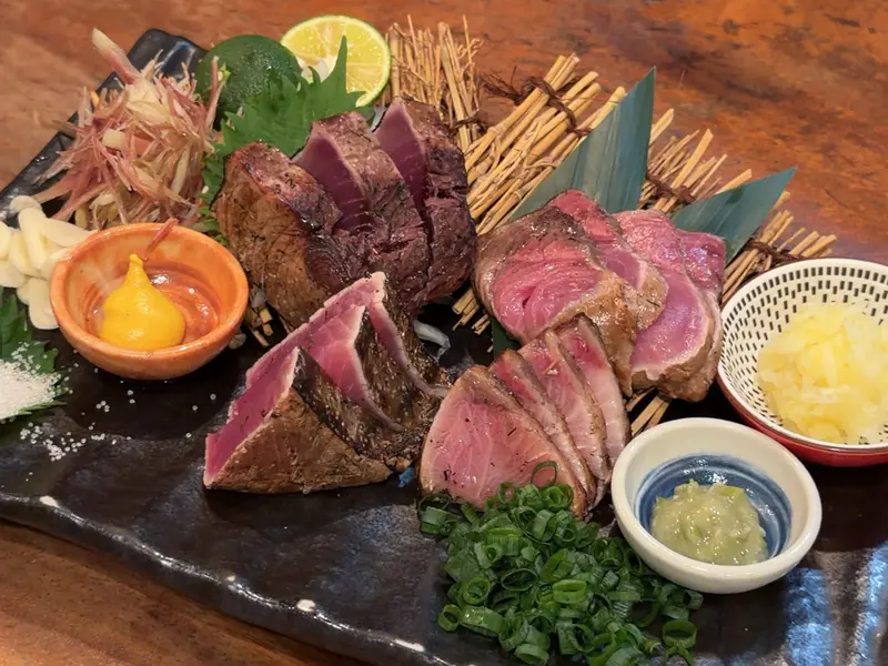 藁焼きといえばやはり鰹!こちらのお店では塩でいただくスタイルです。お皿の上に乗っているみょうがやにんにく、カラシ、すだちなどをお好みで添えて食べてみてください。