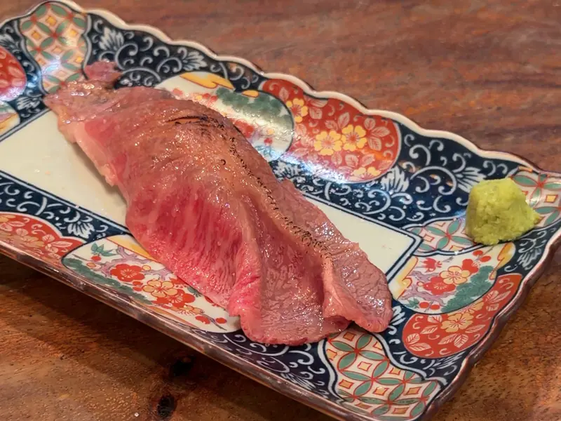 A5ランクの黒毛和牛をバーナーで炙り、旨みと香ばしさを引き出した肉寿司。口に入れた瞬間にとろけるような柔らかさと、和牛ならではの濃厚な旨みが広がる、満足度の高い贅沢な一貫です。