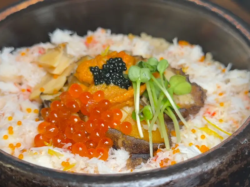 土鍋のフタを開けた瞬間に宝石箱のような海鮮が広がる、贅沢な土鍋飯。あわびをはじめとした魚介の旨みがご飯一粒一粒に染み込み、香りも格別。食事の最後を飾るのにふさわしい、満足感たっぷりの一品でした!