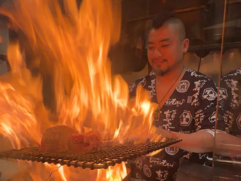 座った席からは藁焼きをする様子が大迫力で見ることができます。高く燃え上がる炎に最初は驚かれる方もいるかもしれませんが、特殊なガードが設置されているため熱さは全然感じないのでご安心を!
