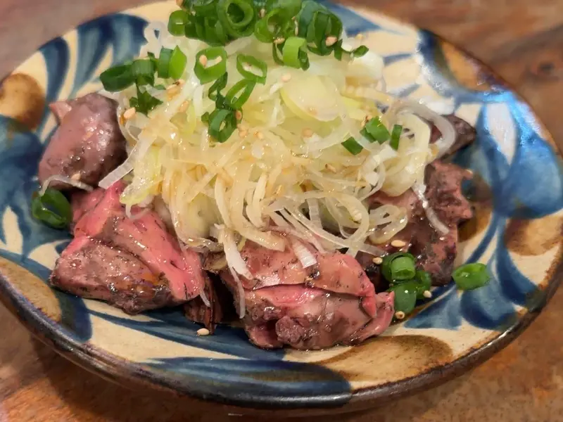 こちらは鶏の首肉の部分「せせり」の藁焼き。むねやモモといった正肉よりも噛みごたえがあり、焼鳥でも人気のある部位です。藁焼きしていい風味をつけ、薬味や卵黄と混ぜて食べるとかなりいいおつまみです!